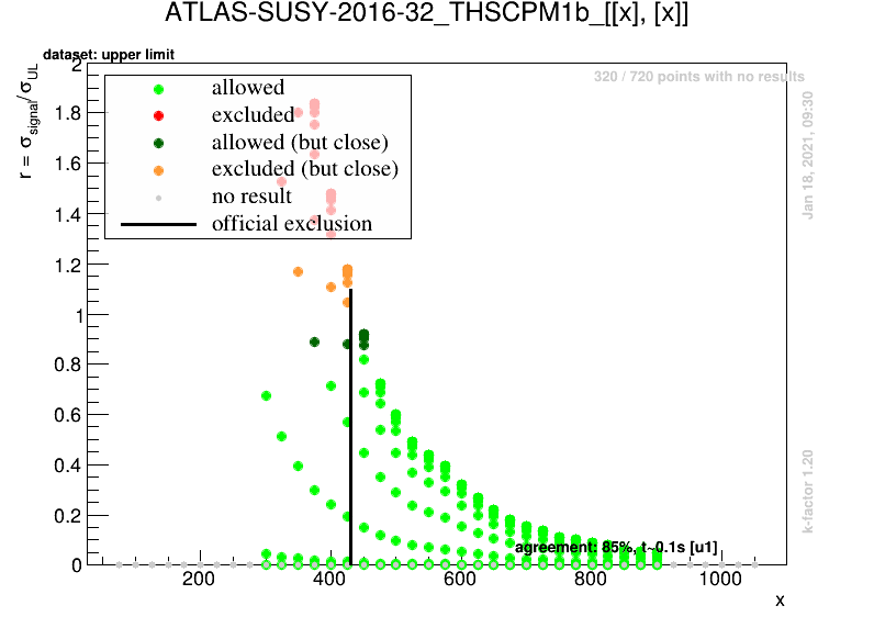 This page lists validation plots for all analyses and topologies available in the SMS results database that can be validated against official results. Neither superseded nor fastlim results are listed in this table. The list has been created from the database version 3.1.1, including the Fastlim tarball that is shipped separately. There is also a list of all analyses, a list of all SMS topologies, and an explicit comparison of best-SR vs combined-SR exclusion lines.